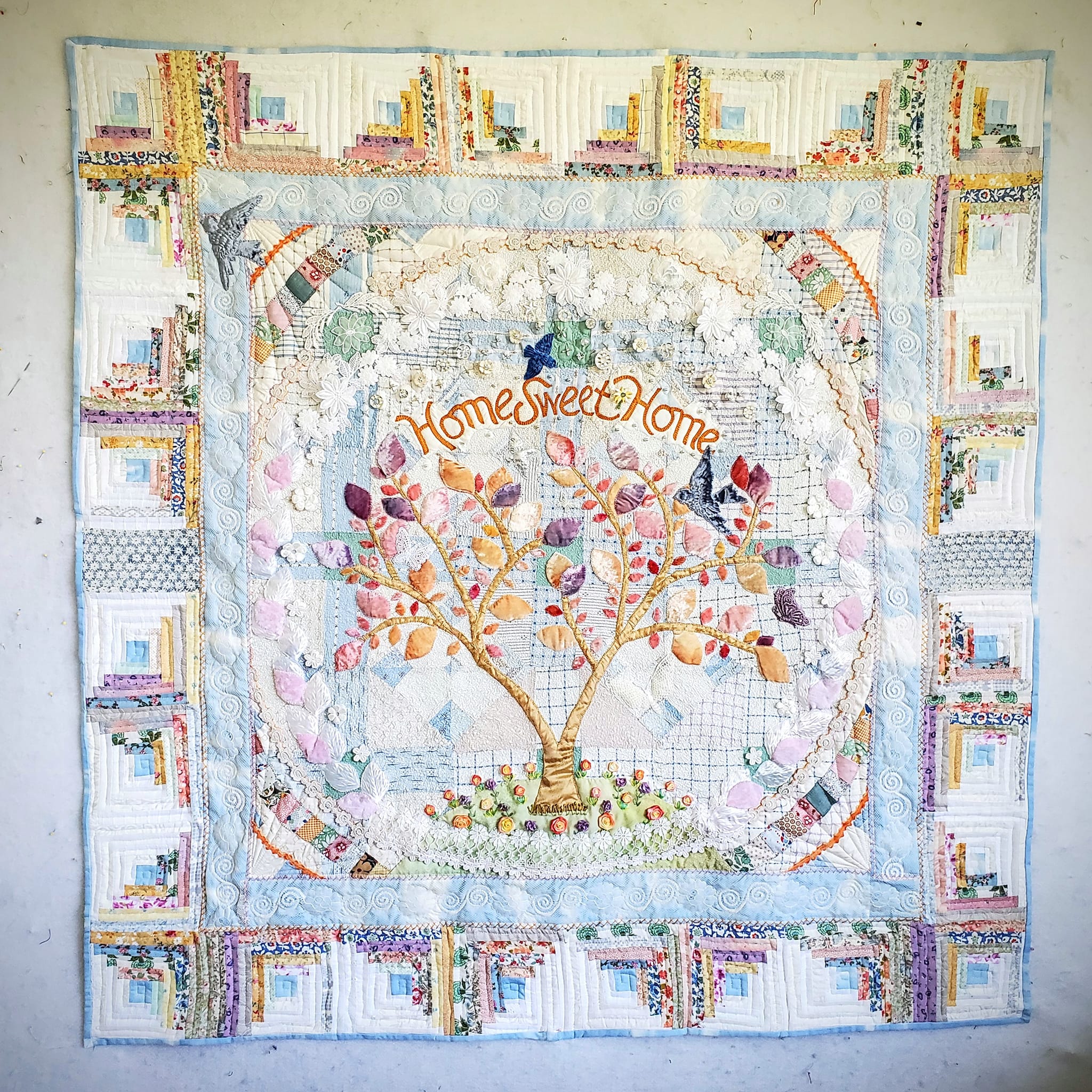 "Home Sweet Home" was a mishmash of collage, piecing, stained glass lettering, embellishment, and quilting. I listened to The Secret Garden on Audible as I worked and it was the perfect soundtrack.